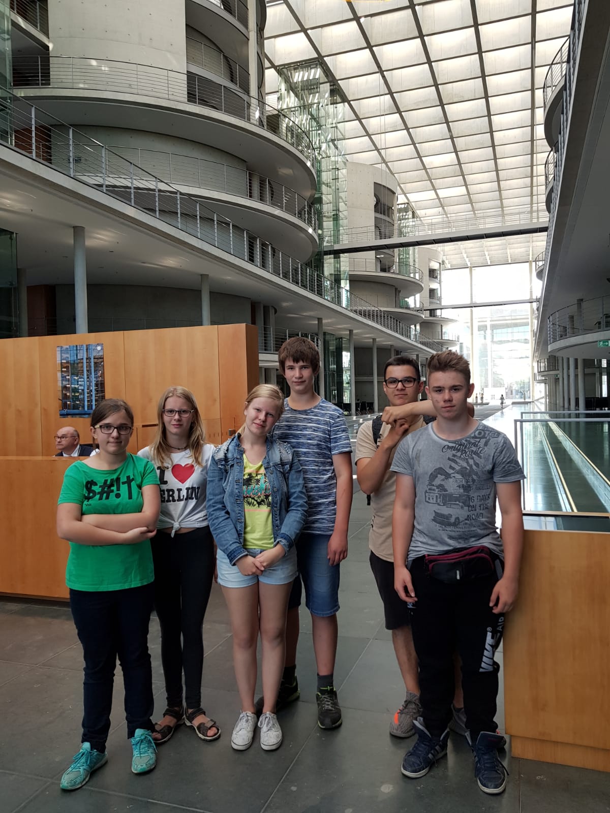 Die Nacht verlief dann eher aktiv. Es gab ja so viel zu erzählen. Jedoch erwies sich das Aufstehritual am nächsten Morgen überraschend konzentriert und zügig, so dass die Gruppe noch über- rechtzeitig beim anstehendem Gespräch mit Vertretern des politischen Berlins gegenüber des Bundeskanzleramts anzutreffen war. Gut vorbereitete Fragen über den Alltag von Abgeordneten und den politischen Betrieb des Bundestags wurden von Herrn Amrhein, dem wissenschaftlichen Mitarbeiter von Herrn Dr. Nüsslein beantwortet. Er selbst befand sich gerade im Verhandlungsmarathon über die Asylfrage, wenige Räume neben uns, im selben Gebäude.