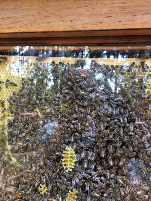 - Die Bienenkönigin ist im Schau-Kasten mit einem gelben Tupfer markiert.